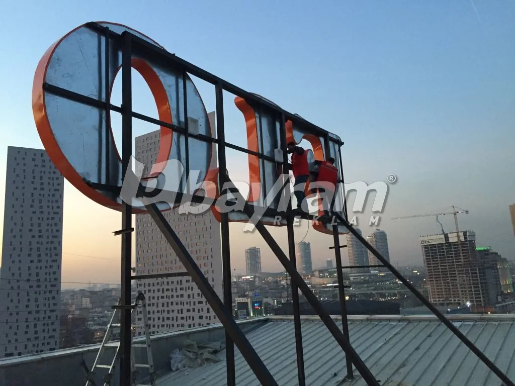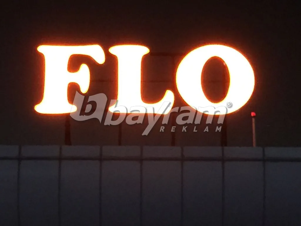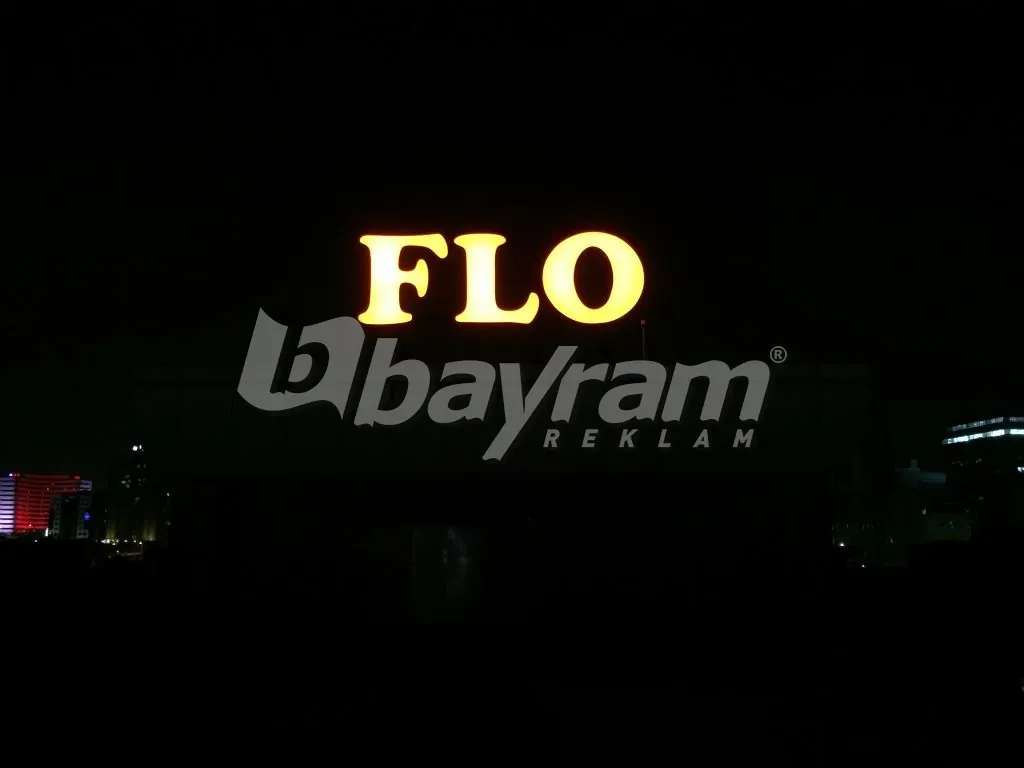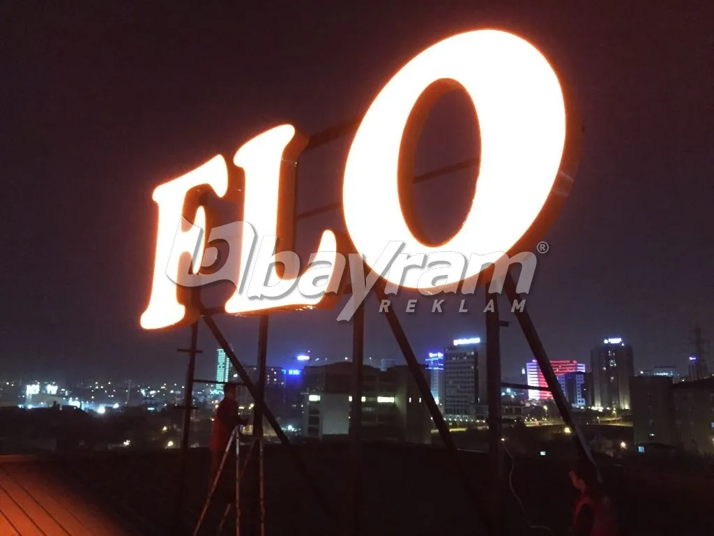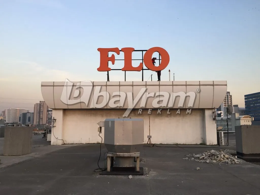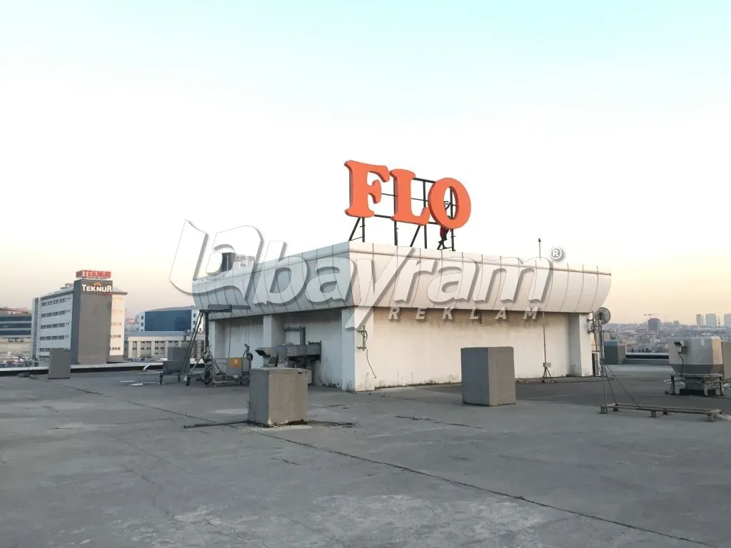 FLO logo çatı kutu harf; 5mm alüminyum dan cnc routerde kesilen harflerin etrafı 30cm alüminyumlar ile kabartılır kabartılan harflerin içine 50x50x4mm alüminyum kutu profil ile karkas yapılır argon kaynağı ile komple kaynatılı,gerekli boya yaş boya yapıldıktan sonra alt zemine 5 cm ara boşluk bırakarak komple samsung marka modül led döşenir.harfin ön kısmı 680gr. Avrupa vinil ile alüminyum gerdime aparatları ile gerdirilip sabitlenir. Vinilin ön kısmı 3M marka folyo ile kaplanın. Alüminyum aparatlar kapanıcak şekilde etrafı daha önceden hazırlanmış köşebentleri vidalanır. Harflerin çatıya montajı için ana taşıyıcı olarak 150x200x8mm kutu profiller ile ızgara yapılır ve harfler vinç aracılığı ile çatıya monta edilir.