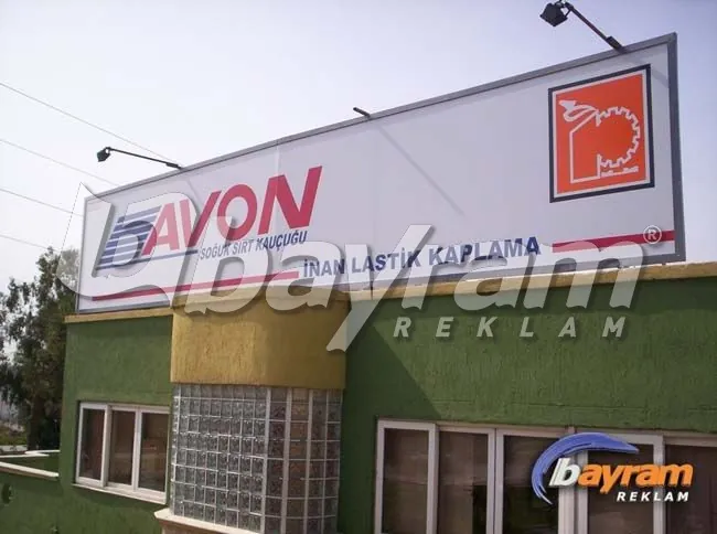 980x200cm ışıksız vinil germe çatı tabelsı;60640x4mm kutu profilden çelik kasası yapılmaktadır.profil kasa ilğili firmanın çatısına monta edildikden sonra 12mm marin su kontrası kullanılarak tüm zemin kaplanır.su kontrası catı tabelalarında rüzgar vinili patlatmaması için kullanılır. 610gr. Avrupa vinil kullanılarak aparatlarla vinil su kontrasının üzerine vinil gerdirilir. Vinilin dayanıklıgı artırılması için 40x30 alüminyum köşebentler kullanılarak tabelanın etrafı dönülür.reklam alanı ORACAL marka folyo kullanılarak ploturda ilgili firmanın reklamı yapılır. Bu tabela türü ölçü bakımında büyük olduğu için maliyette göz önünde tutularak tercih edilmektedir.çatı tabelalarında vinilin tercih edilmesindede bir etken tek parca ve eksiz olmasından daha düzgün ve temiz bir görselik olmasındandır.