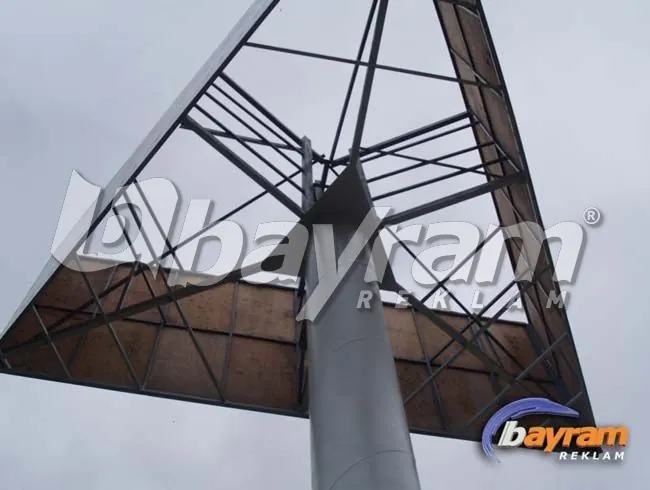 üçgen totem tabela;12metre diregi olan 10x5metre üç yönlü reklam alanlı totem tabeladı.reklam alanı 12mm marin sukontrası ile kaplanıp üzerine 650gr. avrupa vinil kullanılarak dijital baskı yapılıp gerdirilmiştir.100x120mm kutu profil ve 90x90 Lmetal köşebentler kullanılarak ana taşıyıcı kargası oluşturulmuştur.3x3x4metre ebatlarında temeli olan çalışmada temel donatı aksamında 1500kg. inşaat demiri kullanılmıştır. bu tür calışmalarda inşaat mühendiri onaylı statik hesapları olması önemle belirtiriz.